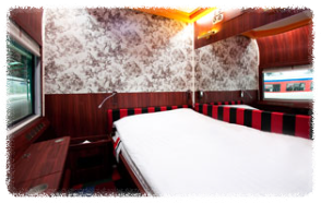 1층 싱글베드(75*185) 2개, 2층 싱글베드(75*185) 2개, 벽면 TV, 화장대, 2인용 소파, 카드키도어, (화장실과 샤워실은 각 호차에 설비된 공용시설 이용)