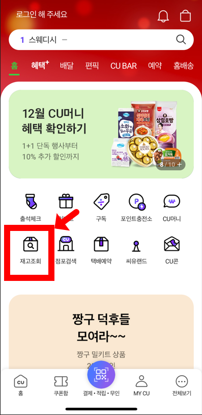 1)아래 CU 앱 모바일 화면과 같이 메인 화면에서 재고 조회하기 메뉴를 눌러주세요.